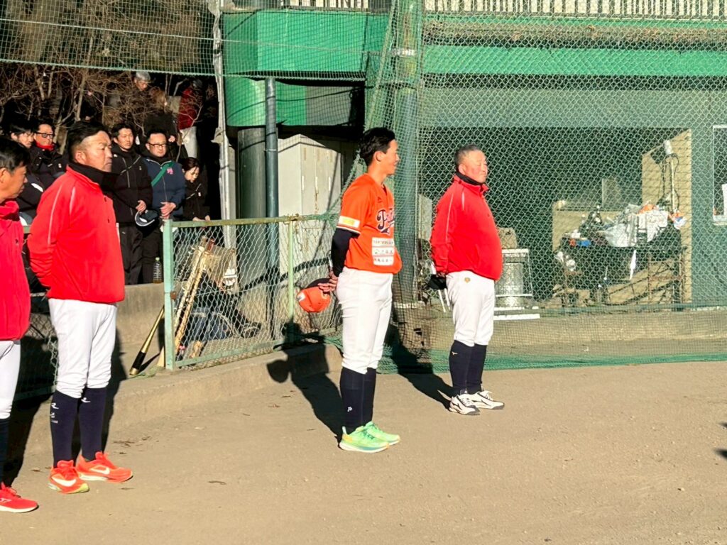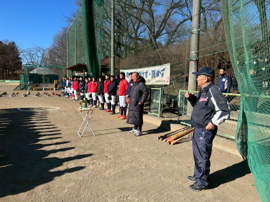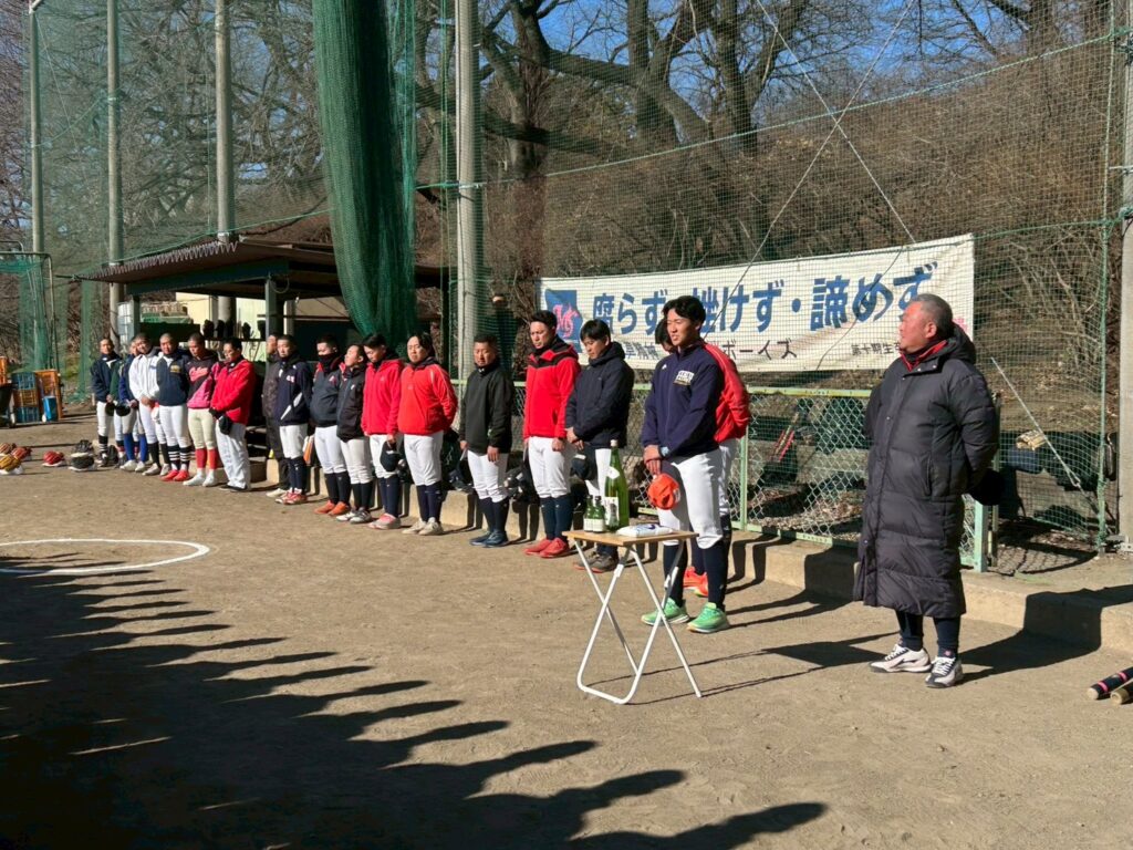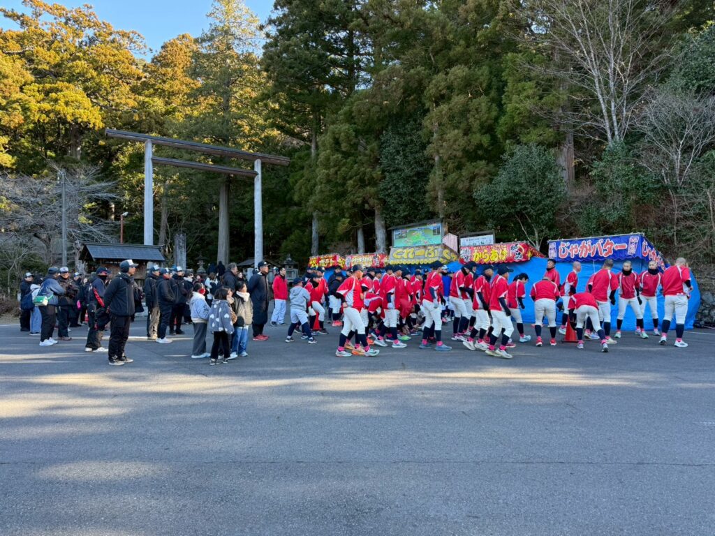 そして球場到着後にグラウンド開き!・・御神酒とお塩でお清め!・・選手もそれぞれのポジションに祈願する事が出来ました!・・2026年も宜しくお願いします!