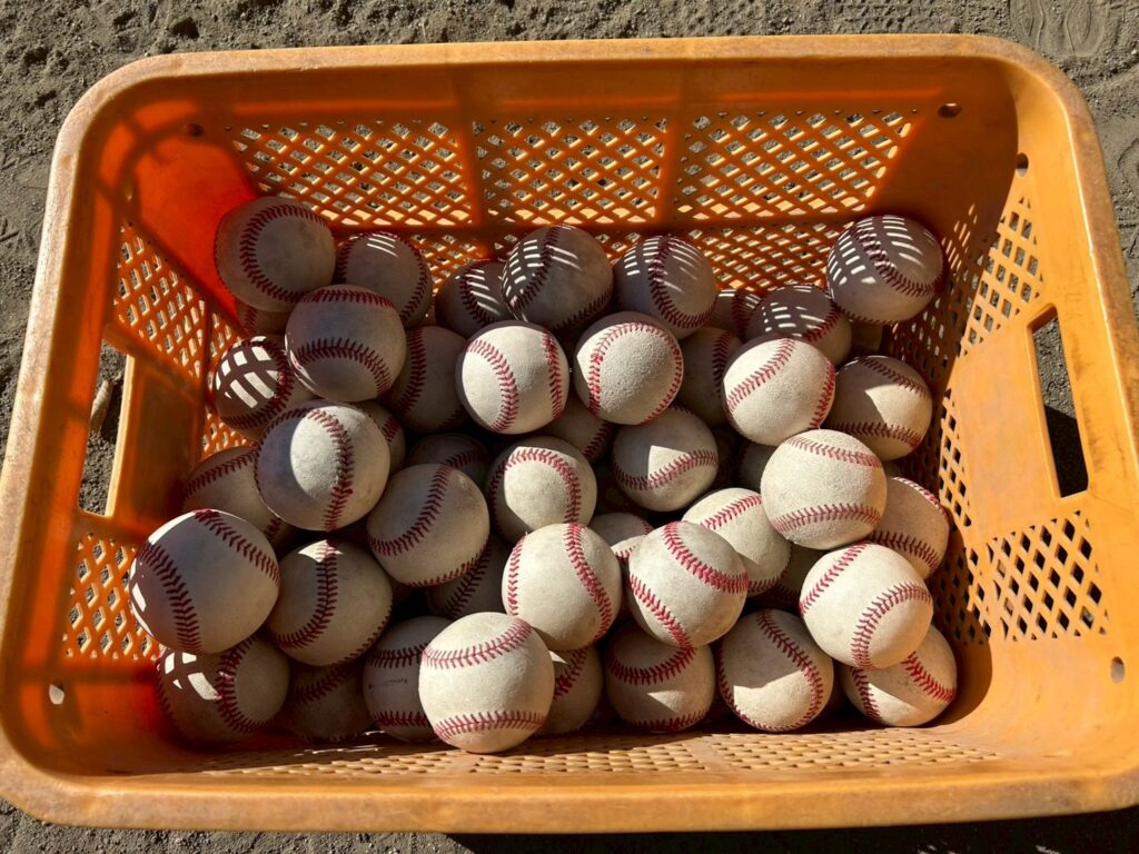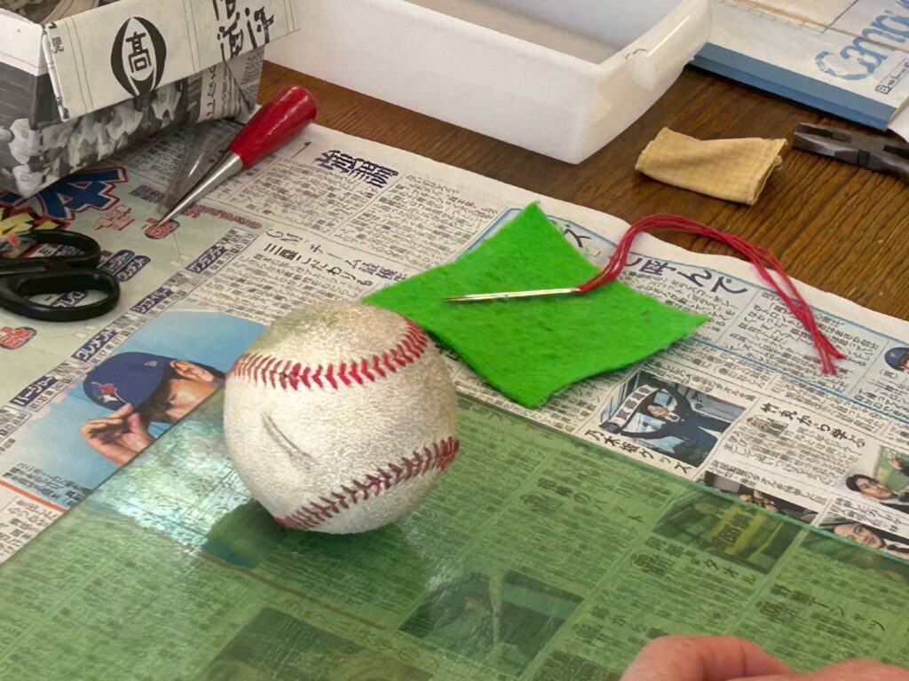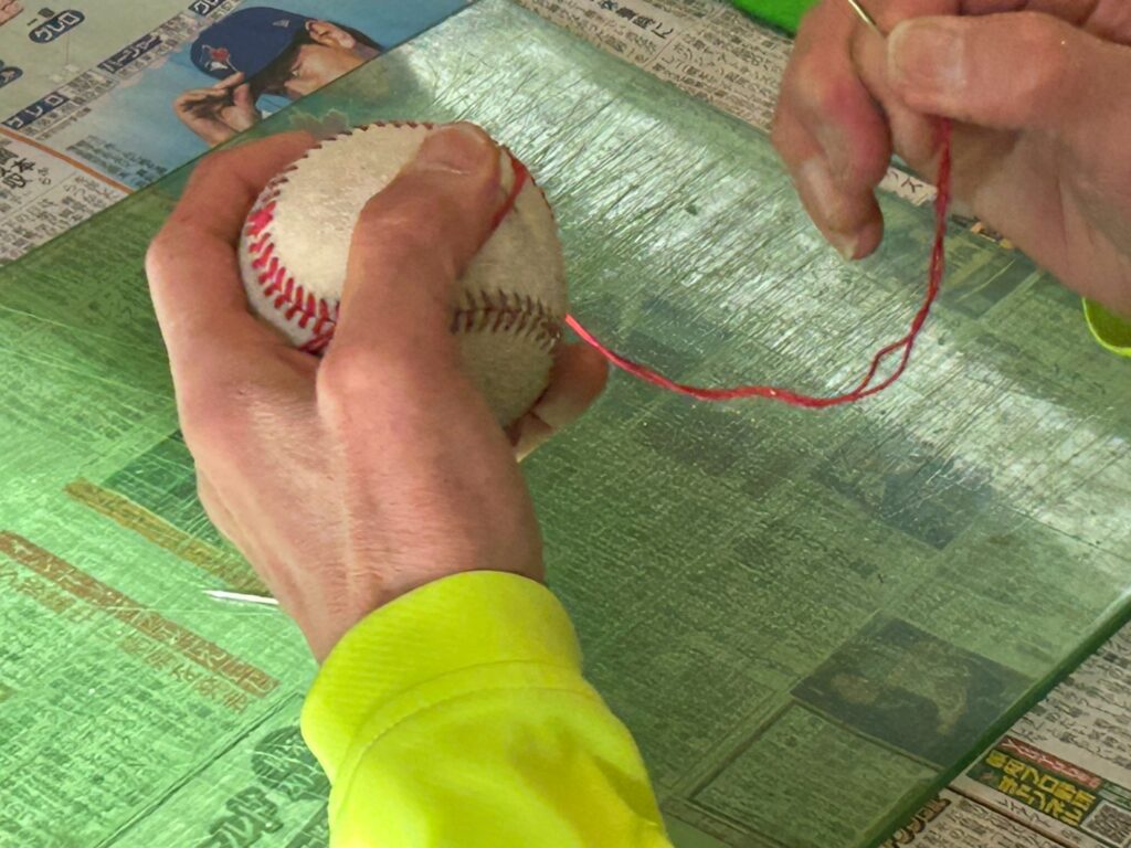 毎日の練習で糸がほつれたり、破れて使えなくなってしまったボールを就労支援施設の利用者の方々が、ひとつひとつ丁寧に修繕し、もう一度使えるように再生する取り組みです。